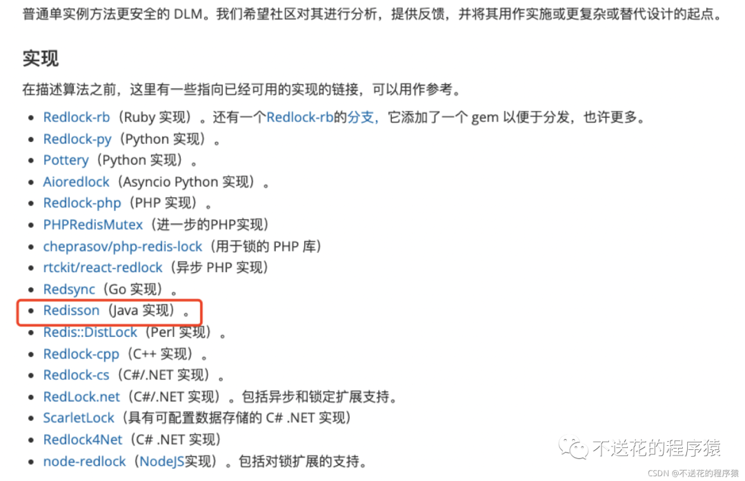那是必须有的,各种锁都提供了,难道还会缺这个么?同时,我们可以在官网看到,官网对于 RedLock 算法的Java客户端实现,首推 Redisson。