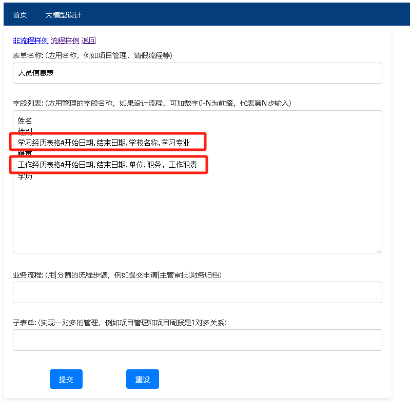 如果只是以表格形式进行存储数据,例如学习经历,工作经历等,不需要对子表单数据进行计算和处理的,只需要通过大模型开发时的简单规则配置即可实现。