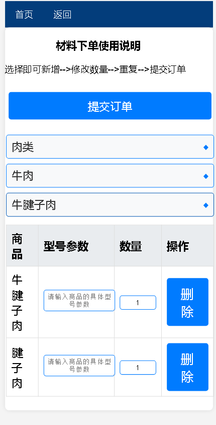 流程订单采购页面,点击下订单,三级菜单选择后自动在最上面添加商品,只需要输入具体型号参数和数量后提交订单,完成后进行订单采购流程审批。