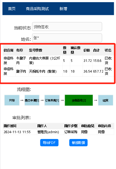 完成后即可实现通过流程管控的采购下单和收货,重点截图如下