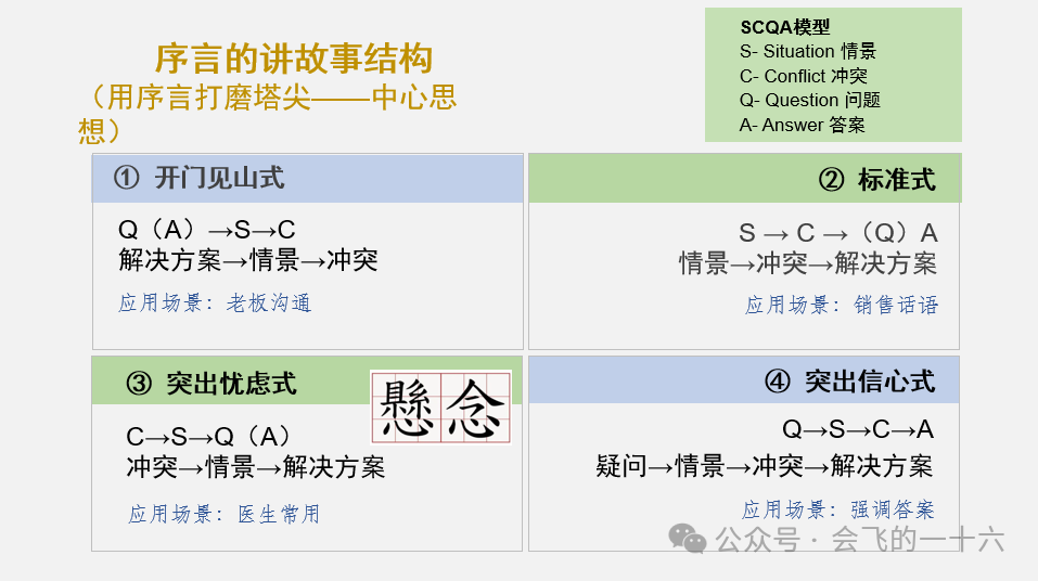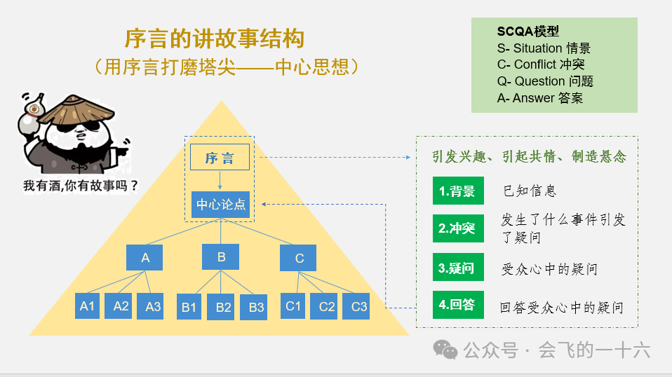 序言的结构:金字塔塔尖打磨,提炼中心思想,采用SCQA模型(背景、冲突、疑问、回答)
