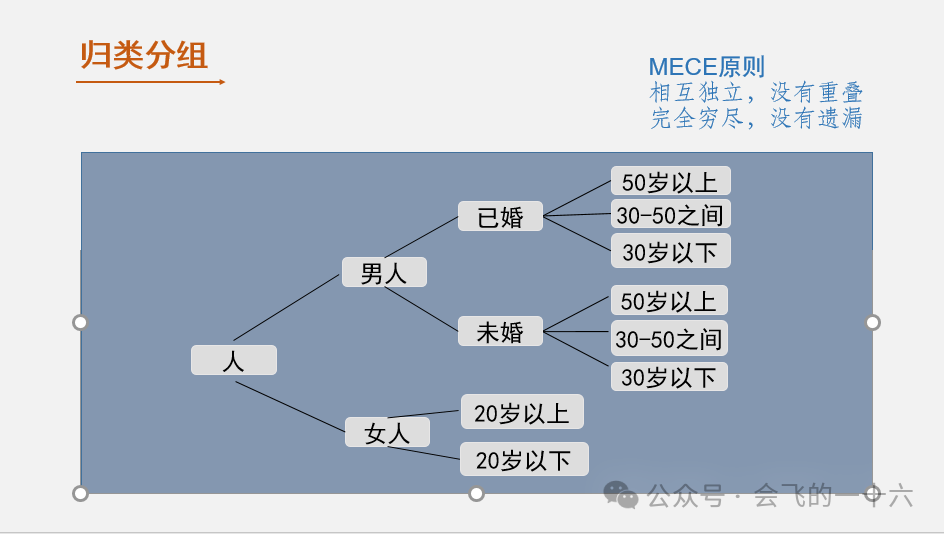 MECE就好比一把尺子,当你面临问题或你要表达一件事情以后,你的各归类组得是互相独立,完全穷尽的。