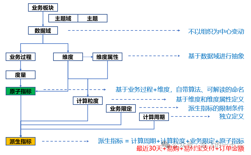 1. 基于业务板块划分数据域,数据域是抽象化的一系列相关业务过程的集合,稳定不变。2. 原子指标对应业务过程事实表(公共明细层DWD)的业务度量,原则上一个业务度量仅定义一个原子指标。3. 计算粒度、业务限定对应事实表的维度及业务环境条件。4. 派生指标必须继承原子指标进行构建。