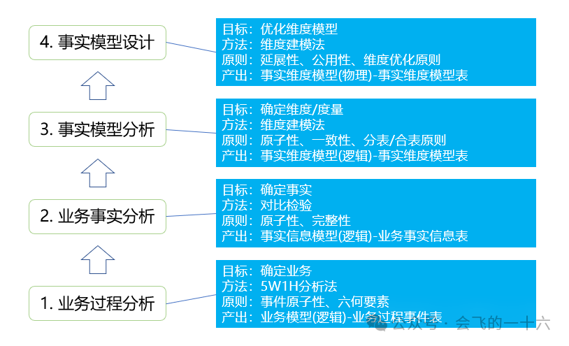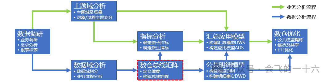 数据调研:主题域分析+数据域->指标+总线矩阵->汇总+明细->优化;