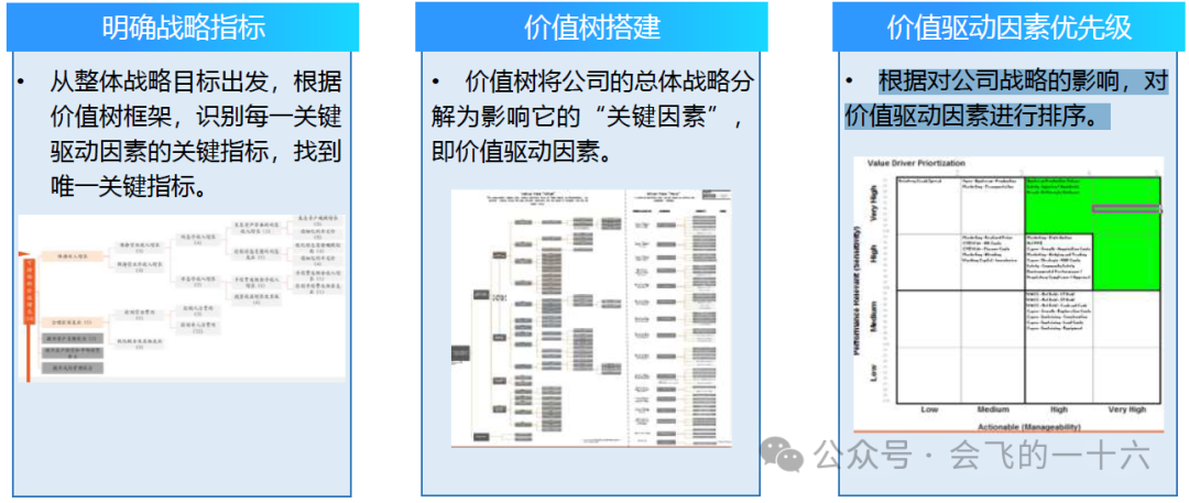 明确战略指标:从整体战略目标出发,根据价值树框架,识别每一关键驱动因素的关键指标,找到唯一关键指标。价值树搭建:价值树将公司的总体战略分解为影响它的“关键因素”,即价值驱动因素。价值驱动因素优先级:根据对公司战略的影响,对价值驱动因素进行排序。