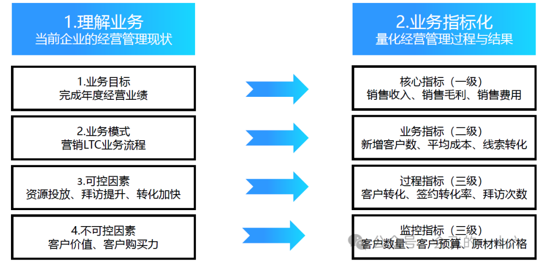 从4个方面自上而下纵向深入理解业务,并基于4类业务事实,量化经营管理过程和结果,分级依次转化为对应的指标: