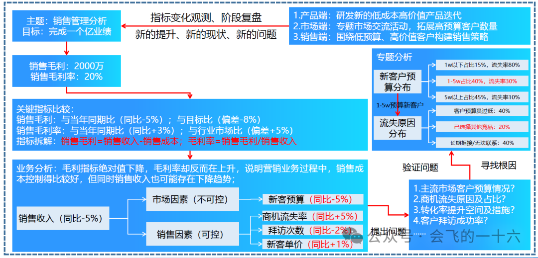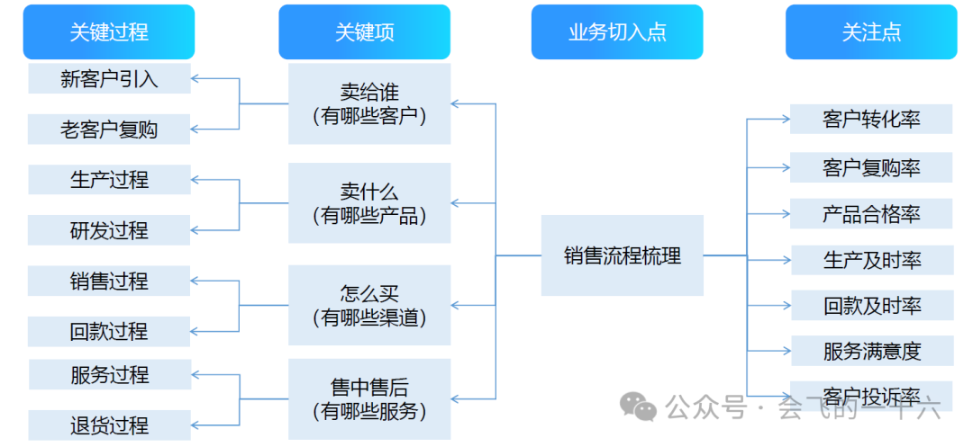 以梳理销售流程为起点,从四个角度分析关键项(卖给谁、卖什么、怎么卖、怎么服务),然后根据关键项获得关键过程,再分别对关键过程基于关注点的五大因素量化指标。