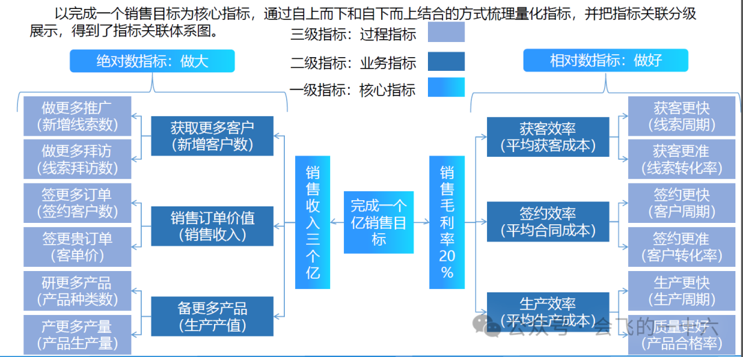 以完成一个销售目标为核心指标,通过自上而下和自下而上结合的方式梳理量化指标,并把指标关联分级展示,得到了指标关联体系图。