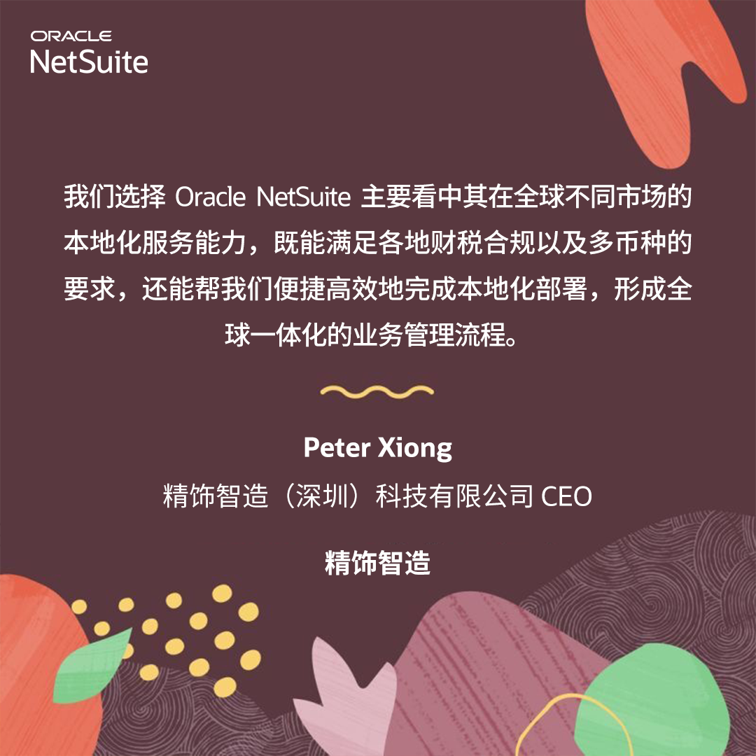 Oracle NetSuite 作为一家拥有全球“基因”的数字化系统,深谙企业全球发展中每个环节的业务需求,其敏捷、可扩展的部署模式,业务、财务全覆盖的一体化功能,能为精饰智造等优秀的中国出海企业提供陪伴式的发展支持,从而全力推动中国企业的全球业务拓展进程。