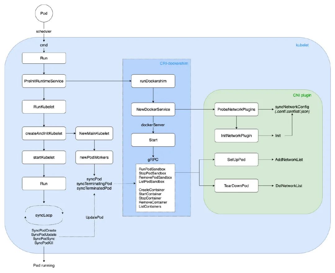 Run -> syncLoop -> SyncPodCreate/Kill -> UpdatePod -> syncPod/syncTerminatingPod -> dockershim gRPC -> Pod running/teminated
