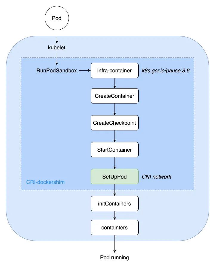 经过上一步 Pod 事件的生产与消费传递,PodWorkers 会将事件转化为 gRPC client 请求,然后调用 dockershim gRPC server,进行 PodSandbox、infra-container(也叫 pause 容器) 的创建。