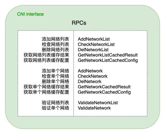 CNI 标准规范接口,包含了添加、检查、验证、删除网络等接口,并提供了按列表或单个进行网络配置的两组接口,方便用户灵活使用。