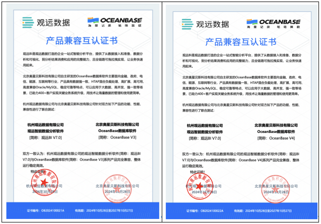 此次 OceanBase 数据库软件 V3、OceanBase 数据库软件 V4 与观远 BI V7 完成产品兼容认证,将支持OceanBase作为数据源接入,BI 分析结果也可直接回写到 OceanBase 数据库,并允许将观远BI存储层的元数据库指定为 OceanBase。同时,基于 OceanBase 的 HTAP(混合负载处理)能力,双方将为客户提供高性能的实时 BI 查询分析,在数据实时分析、快速决策等场景中发挥更大效能。