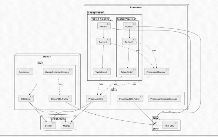 - ProcessorDDLPuller:由 Processor 持有,负责拉取和过滤上游 TiDB 集群的 DDL 事件,然后把它们发送给 Processor 去更新 ProcessorSchemaStorage。