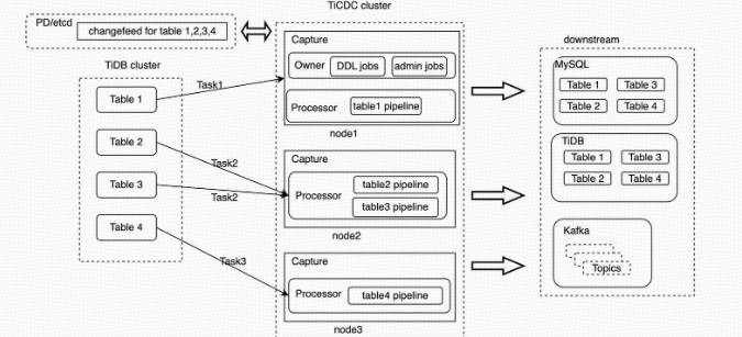 - Changefeed 是由用户启动同步任务,一个同步任务中可能包含多张表,这些表会被 Owner 划分为多个子任务分配到不同的 Capture 进行处理。每个 Processor 负责处理 ChangeFeed 的一个子任