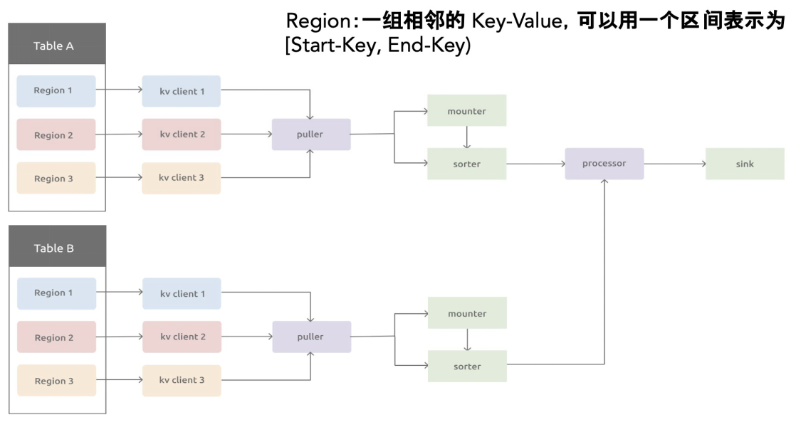 tikv client 是按照 region 拿到 resolved ts,在 puller 中,会按照表为单位对 resolved ts 进行合并,计算出一表级别的 resolved ts。
