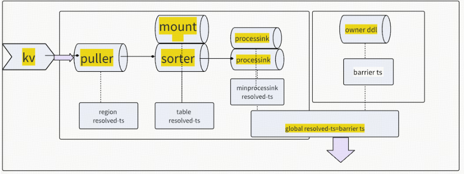 sink 模块以 resolved ts 为约束,将该 resolved ts 之前的数据都同步到下游,为了保证一致性,引入了barrier ts 来做全局讲度的约束。sink 模块的 resolved ts 计算方式: min( barrier ts.resolved ts fromsorter)。 其中 barrier ts 的计算方式可参考后面的内容。Processor 眼中的 resolved ts