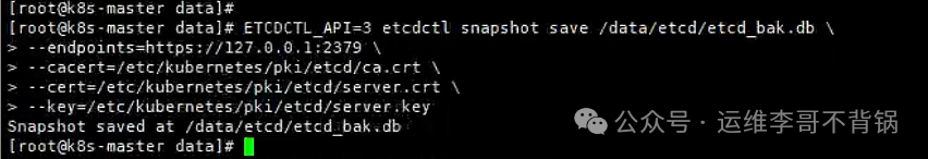 ETCDCTL_API=3 etcdctl snapshot save /data/etcd/etcd_bak.db \