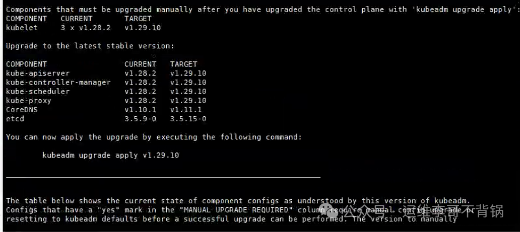 此命令检查你的集群是否可被升级,并取回你要升级的目标版本。命令也会显示一个包含组件配置版本状态的表格。