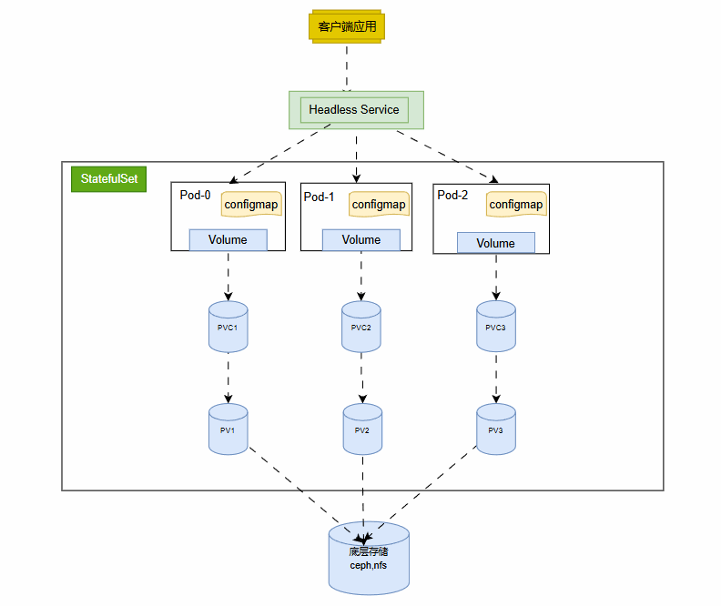 | PersistentVolumeClaim (PVC) | 每个 Pod 绑定一个独立的 PVC,用于存储持久化数据。 |