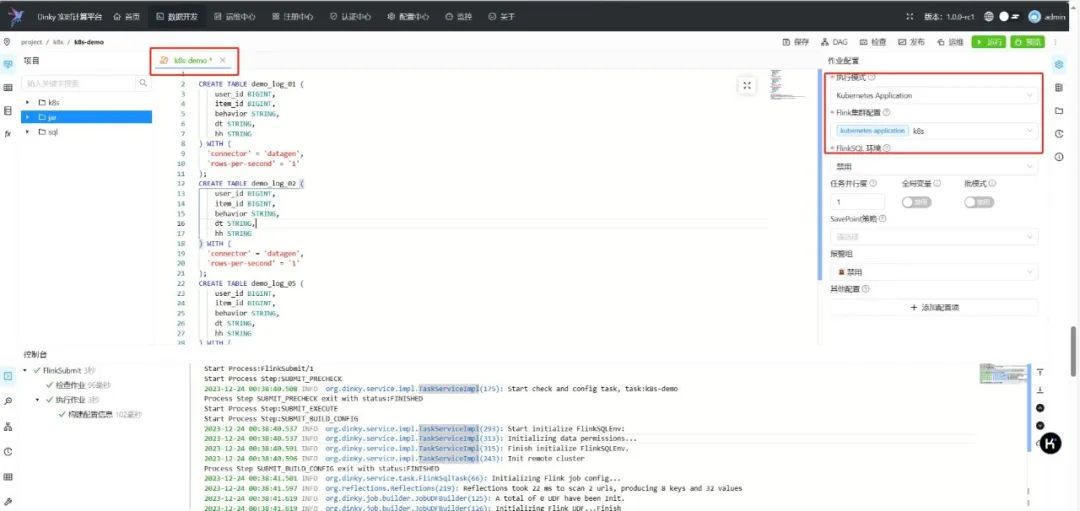 进入数据开发页面,新建一个flink sql任务,选择集群类型为kubernetes application,集群选择为我们刚刚配置的集群,点击提交即可。
