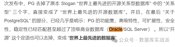 但比起具体的某些功能特性,我认为 PG 社区最大的转变在于心态与精神—— 在这次发布中,PG 去掉了原本 Slogan “世界上最先进的开源关系型数据库” 中的 “关系型” 三个字,直接变成了 “世界上最先进的开源数据库”。并且,在最后 “关于 PostgreSQL” 的部分,已经几乎是明示:PG 的功能集,高级特性,可扩展性,安全性,稳定性已经匹配甚至超过了顶级商业数据库(Oracle/SQL Server) 。所以“开源” 这个定语也可以去掉,变成 “世界上最先进的数据库”