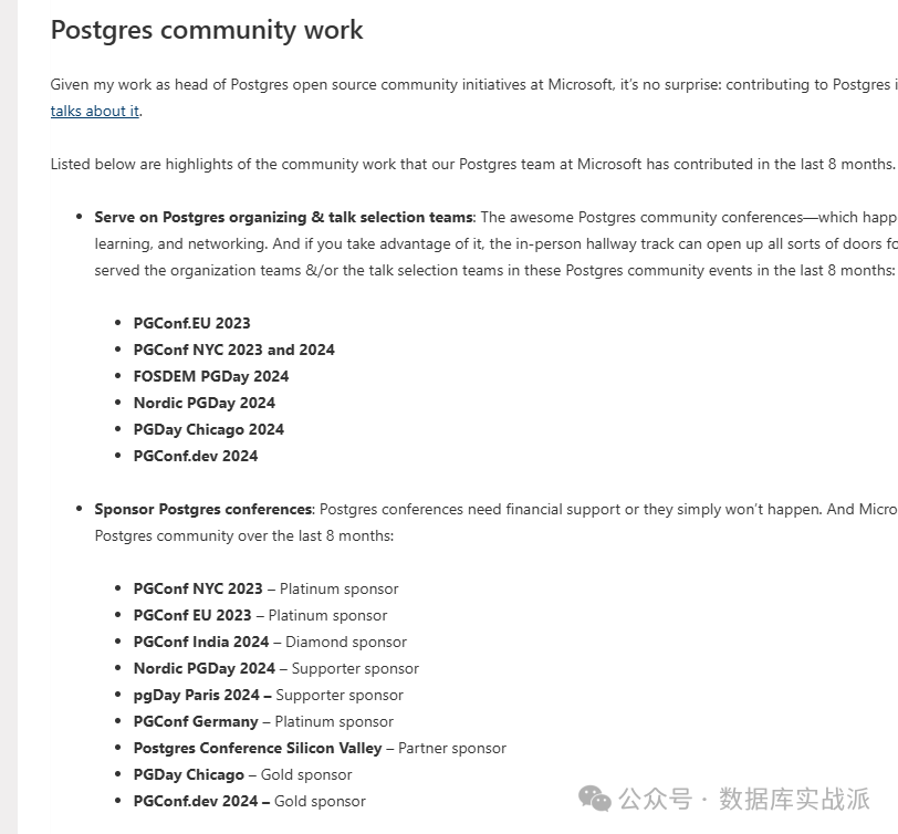 微软是多个PostgreSQL相关活动的赞助商,如PGConf NYC、PGConf EU等。在过去几年里,微软不仅参与这些会议,还为会议提供了赞助支持,确保这些社区活动的顺利进行。SQL PASS峰会是微软主导的最大型的数据社区活动,近年来PostgreSQL的推广在这个峰会中也越来越频繁,从下文中可以看到微软赞助了除了中国区以外的所有PGConf大会。