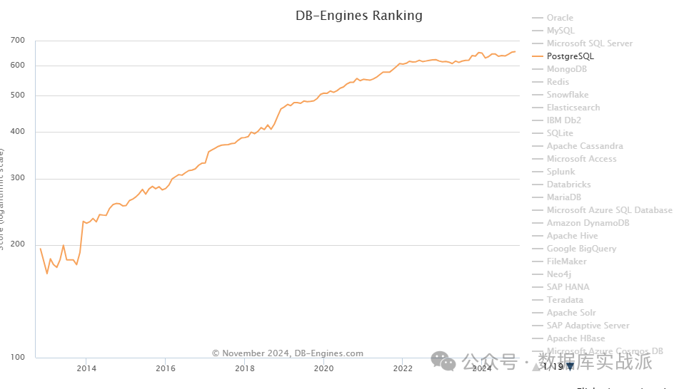 下图可以看出PostgreSQL的使用量在多年来一直保持强劲的增长,相信未来3到5年超越MySQL完全不是什么难事