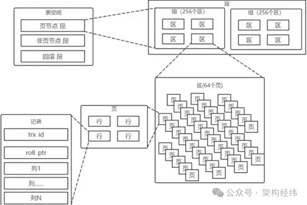 InnoDB 的存储结构较为复杂,其将数据划分为若干个页,页的大小默认是 16KB,是磁盘和内存交互的基本单位。数据库中还存在区、段和表空间的概念。区是比页大一级的存储结构,一个区会分配 64 个连续的页,大小为 1MB。段由一个或多个区组成,是数据库中的分配单位,比如创建表和索引时会创建相应的段。表空间是一个逻辑容器,可以有一个或多个段。