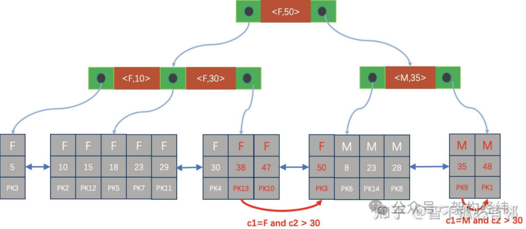 再看另一个例子,表 t5 有索引 c1, c2,并且 distinct(c1)的值很小。如果查询语句是“select c1, c2 from t5 where c2 > 30”,就像下图所示: