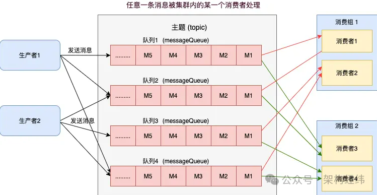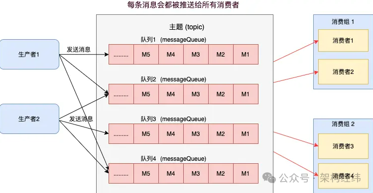 (2)广播模式:在广播模式下,每个消费者都会收到主题下所有队列的消息,适用于需要广播消息的场景。