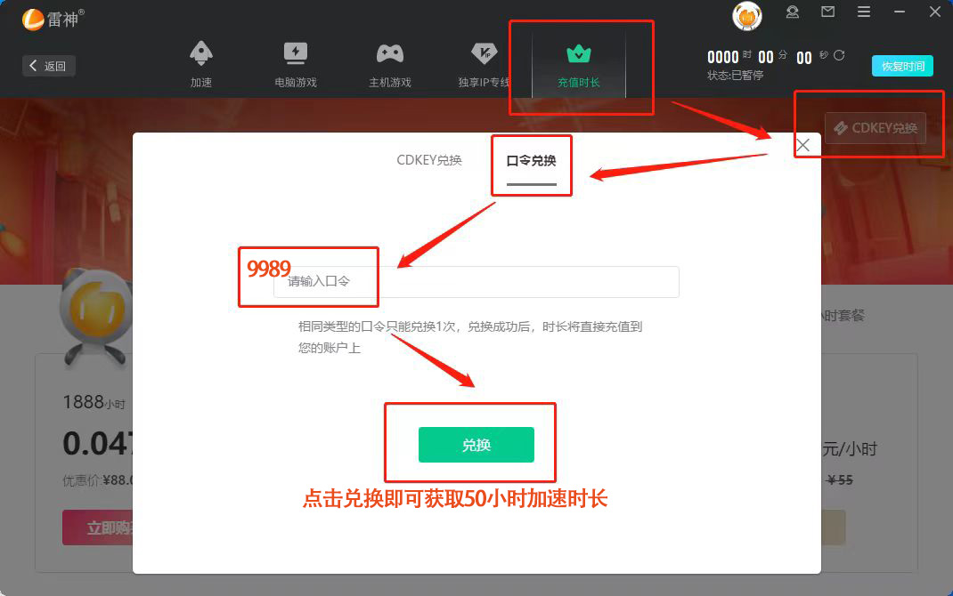 电脑端兑换也非常简单。您只需打开雷神加速器客户端,点击右上角的【头像】,选择【CDK/口令兑换】,在兑换界面输入口令如“9989”,即可完成兑换。电脑端兑换让您随时随地都能享受到雷神加速器的加速服务。