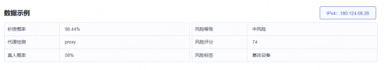 real | String | 真人概率 | 判别IP流量是否由真实人类产生,0%至99%进行真人概率打分,接近0%意味着更趋近机器行为 |