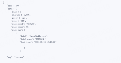 risk_score | String | 风险评分 | 根据风险证据、风险标签、代理类型发生时间及风险类型综合评分(可根 据行业风控定制打分) |