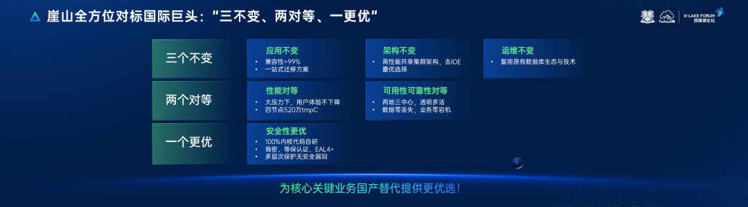 深算院首席技术官兼崖山科技总裁陈志标在会上表示,崖山数据库以“三个不变,两个对等,一个更优”为金融核心场景带来高品质和高性价比的1:1平替方案,“三个不变”即“架构、应用、运维不变”,在架构层面突破共享集群“塔尖技术”,实现和国际标杆完全对等,应用层面高度兼容,无需额外改造,运维层面可直接复用原有数据库的生态和技术;“两个对等”即“性能、可用可靠性对等”;“一个更优”即“安全性更优,为规模化核心替代带来新解法。据估算,相对于应用系统重构典型业务场景,崖山1:1平替方案在整体拥有成本方面减少50%,充分释放数据驱动的创新价值。