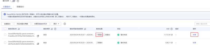 快照恢复的使用方式与远端恢复类似。当快照恢复可用时,页面会显示出“一级备份”,客户点击“恢复”即可。若一级备份可用,则会优先使用该一级备份的数据进行快照恢复,如图6所示:
