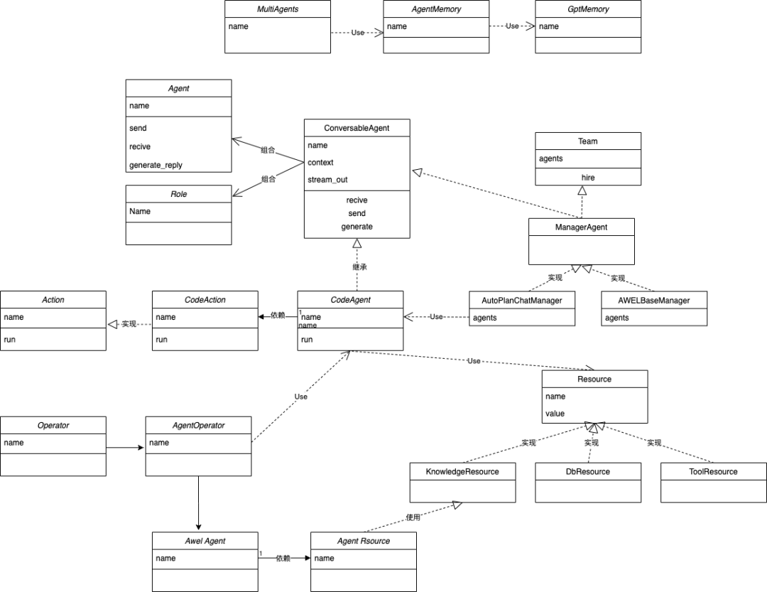 # 实际Agent在Flow里的绑定节点(把Agent作为Agent算子容器的资源)class AWELAgent(BaseModel):# Agent的绑定资源,将Agent的绑定资源作为Agent资源节点的资源节点### Agent资源class AWELAgentResource(AgentResource):"""AWEL Agent Resource."""### Agent知识库资源class AWELAgentKnowledgeResource(AgentResource):### Agent的Prompt资源class AgentPrompt(BaseModel):### Agent的模型配置资源class AWELAgentConfig(LLMConfig):