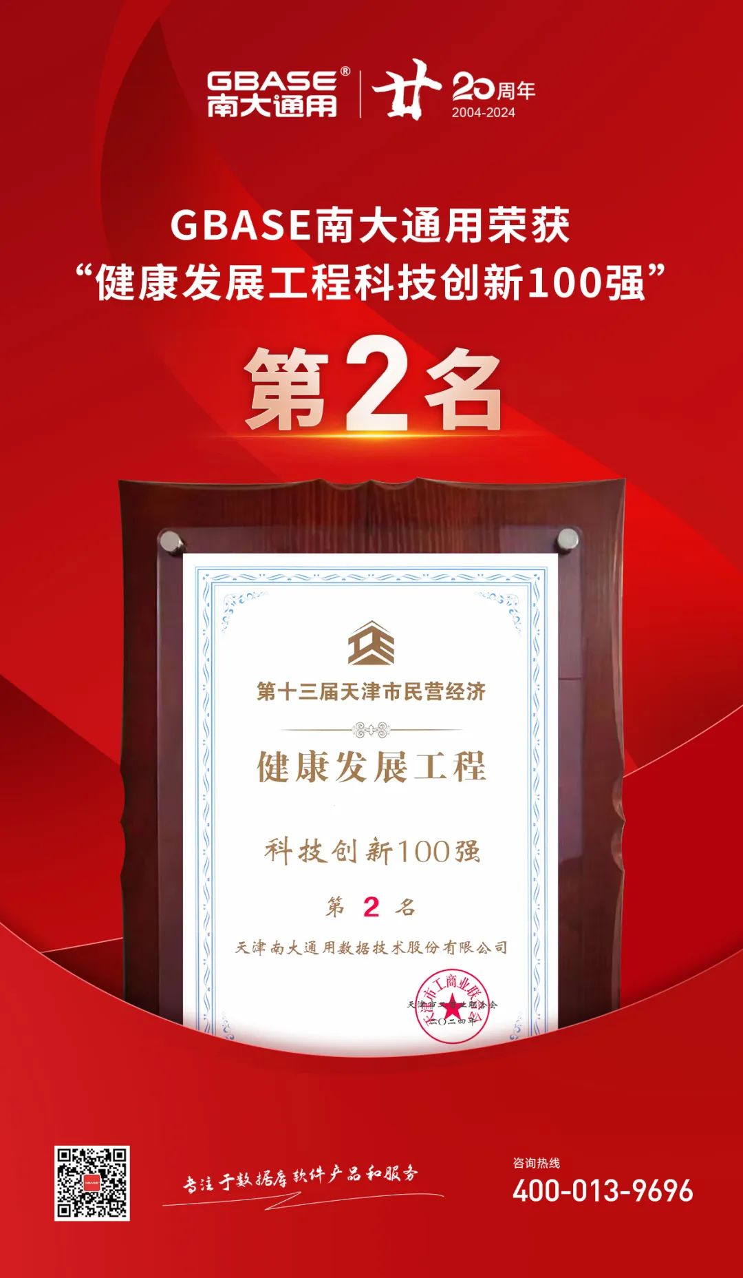 GBASE南大通用凭借在研发投入、创新成果以及行业应用等方面的杰出表现,入选“天津市第十三届民营经济健康发展工程科技创新100强”,位列榜单第2位。