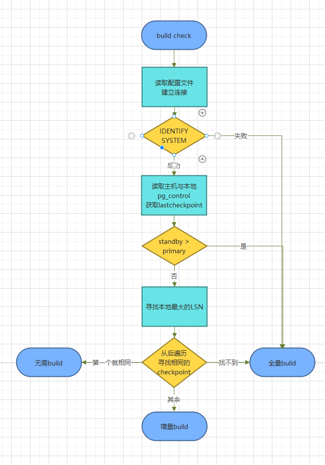 1.读取主机和备机的pg_control的ckpt2.通过ckpt 开始去寻找最大的共同分叉点3.如果找不到公共分叉点,证明主机日志已经被回收,需要做全量build4.如果能找到最大公共分叉点,且这一点与备机ckptrec相等,则证明日志无分叉,只是落后,无需build5.能找到日志分叉点,且这一点不是备机最大ckpt,需要做增量build