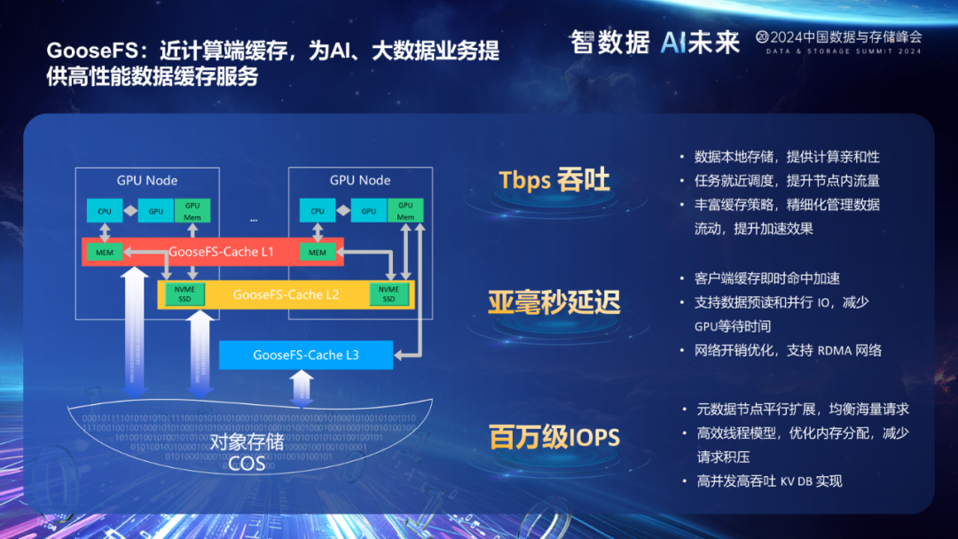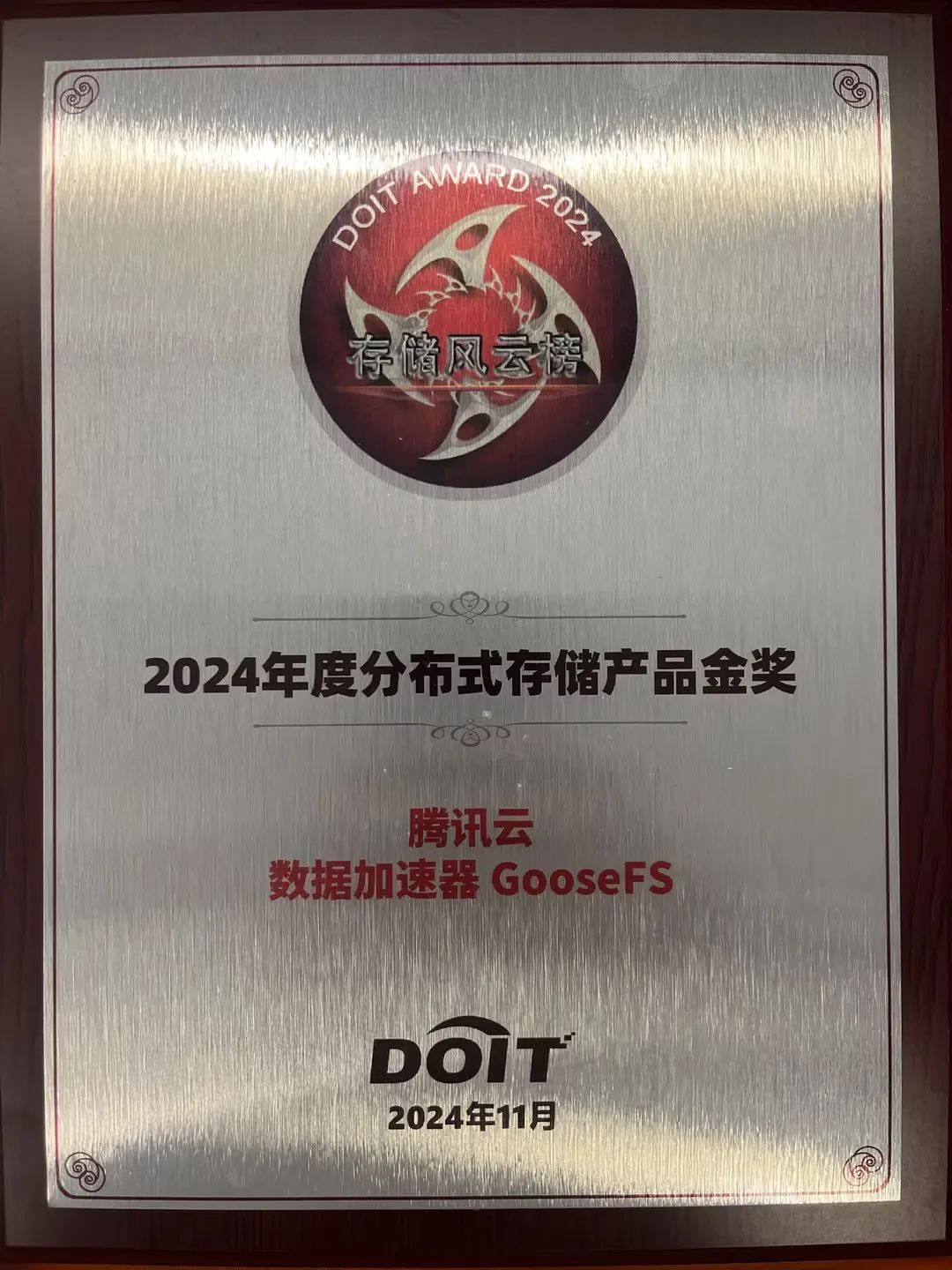 在峰会发布的“2024存储风云榜”中,腾讯云数据加速器 GooseFS 荣膺“2024年度分布式存储产品金奖”。“2024存储风云榜”展示了数据存储领域的创新成果,引领下一代技术的突破与落地,为行业选型和应用提供了重要参考,同时也激励更多企业持续创新。