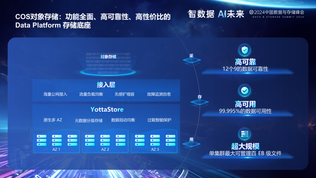 在海量数据存储需求之下,对象存储 COS 作为 Data Platform 的存储底座,采用腾讯云自研的 Yotta 架构,单集群规模可达100 EB,支持多种存储类型和管理功能,为企业提供高可靠性、低成本的海量数据存储服务,帮助企业应对 AI 数据的存储需求。随着众多企业对 AI 业务的投入,当算力和模型规模达到一定阶段后,模型的能力往往取决于数据的数量和质量,COS 的高可靠性和可用性、低成本、成为了企业海量数据存储的首选。