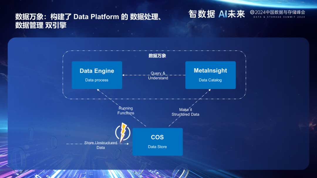 腾讯云存储专家解决方案架构师王登宇应邀出席本次峰会,并在“ AI + 存储协同发展论坛”中发表了题为“腾讯云 Data Platform:探索智能存储之未来之旅”的演讲。本次演讲聚焦腾讯云数据平台如何突破传统存储的边界,通过整合 COS 对象存储、MetaInsight 智能检索、Data Engine 数据处理引擎和 GooseFS 数据加速器系统,构建全面的 AI 存储解决方案,优化大数据和 AI 业务中的数据管理,提升计算效率,为各类智能应用的持续发展提供坚实支撑。