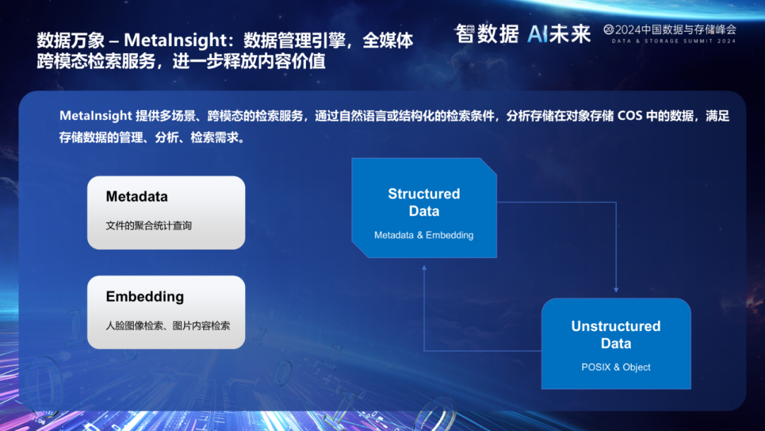 近期,腾讯云发布了 MetaInsight,这一创新工具旨在提升多模态数据的检索效率。基于AI大模型和向量数据库,MetaInsight 为用户提供跨模态的数据检索能力,能够高效地挖掘多种类型数据中的深层价值。MetaInsight 的核心定位是作为 COS 对象存储的 Data Catalog,针对 COS 存储中的数据提供多场景、多模态的检索服务。它通过自然语言处理或结构化检索条件分析存储的数据,满足数据管理、分析、检索等全方位需求。