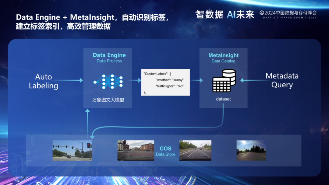 Data Engine 的智能处理通过大模型自动识别数据内容,并对数据进行定制化标注。识别的标签可写入 MetaInsight 建立索引,后续可通过元数据查询快速检索对应数据集,提升数据的管理效率。