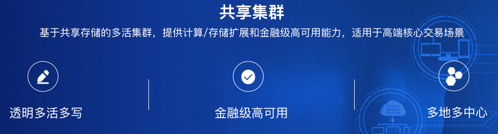 - 共享集群是一个单库多实例的多活数据库系统,用户连接任意实例都可以访问同一个数据库,多个数据库实例可以并发读写同一份数据,且保证实例之间读写的强一致性,具备高可用、高扩展、高性能等特性。