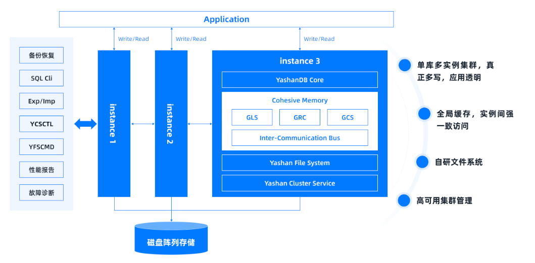 共享集群基于YashanDB内核持续演进,硬件上依赖共享存储实现shared-Disk的架构,同时引入了Cohesive Memory核心技术实现Shared-Cache能力,可在集群数据库多个实例之间协同数据页的读写访问以及各种非数据类资源的并发控制,主要特点包括: