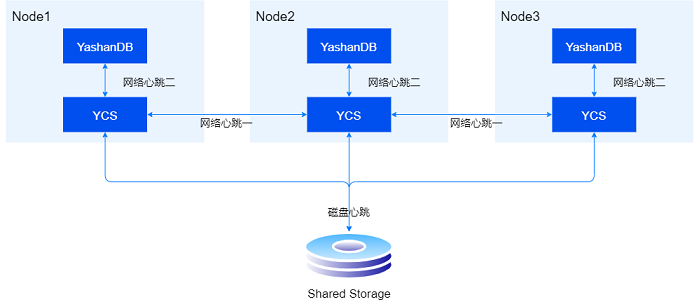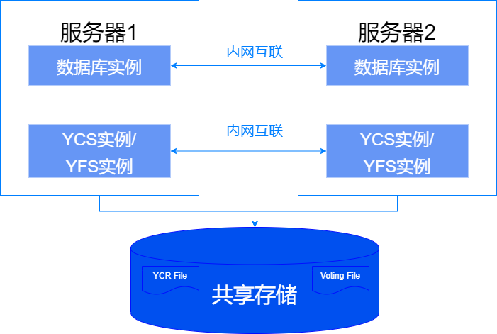 共享集群每台服务器上会部署 YCS 实例(一组为 YCS 服务的线程称为一个 YCS 实例)和数据库实例,同一集群中不同服务器上运行的 YCS 实例和数据库实例完全一样,并通过内网互联。