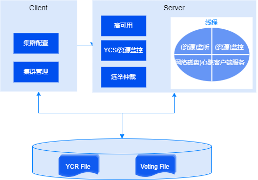 - 集群投票文件(Voting file):是所有服务器运行期会周期性写入状态信息的磁盘文件。在故障发生时,需要在集群投票文件进行投票并决定哪些服务器幸存而哪些服务器被逐出集群,无法访问投票文件则无法获得最新集群状态信息,相关YCS实例和数据库实例无法正常运行。