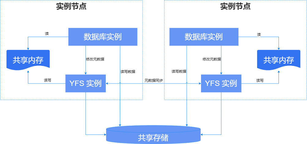 - YFS 分配空间的最小单元较大,以确保文件分区表(FAT)信息占用空间较小,并能够常驻内存。此外,YFS 采用共享内存技术,以供数据库实例直连访问,从而降低时延。