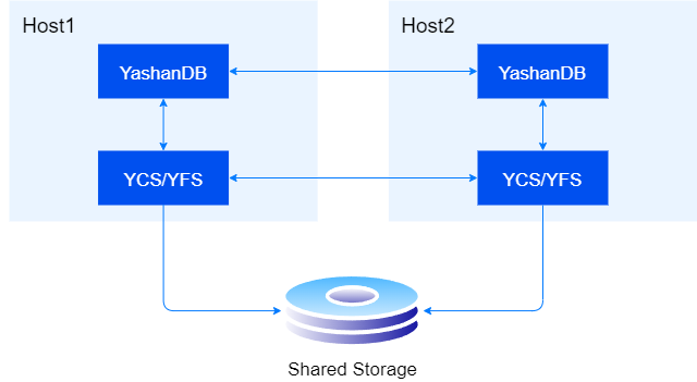 YashanDB 在共享集群部署形态下,在硬件上需依赖共享存储,在软件上也引入新的基础设施,包括崖山集群服务 YCS 和崖山文件系统 YFS,分别提供集群管理和并行文件服务的能力。